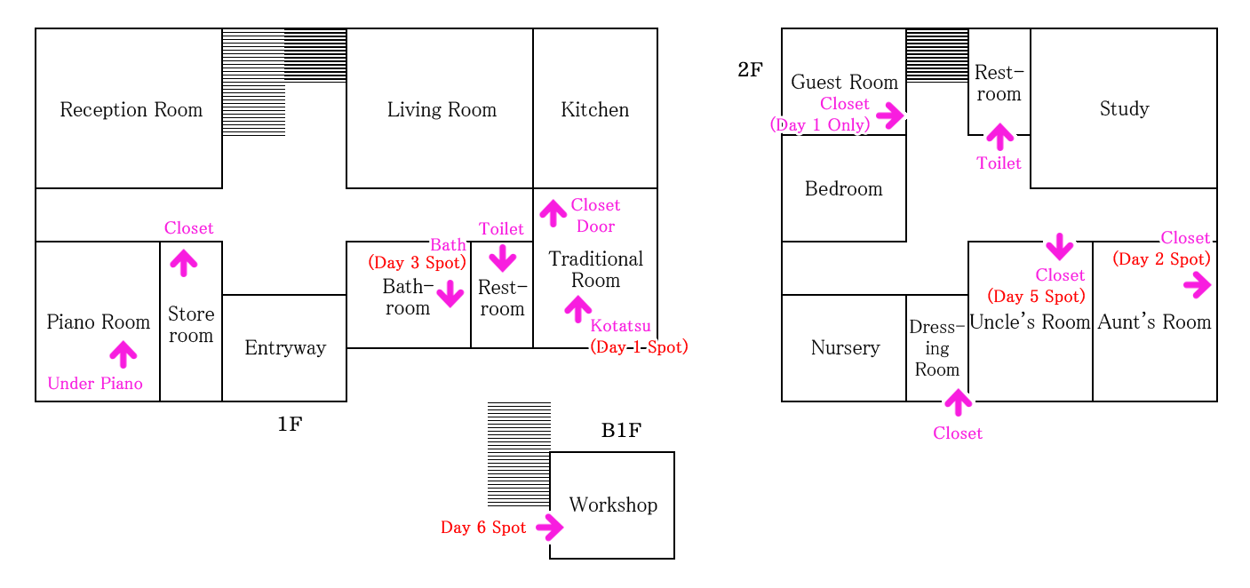 DAY 5 HIDING PLACE: The closet in Uncle's Room (2F east, bottom-left door).