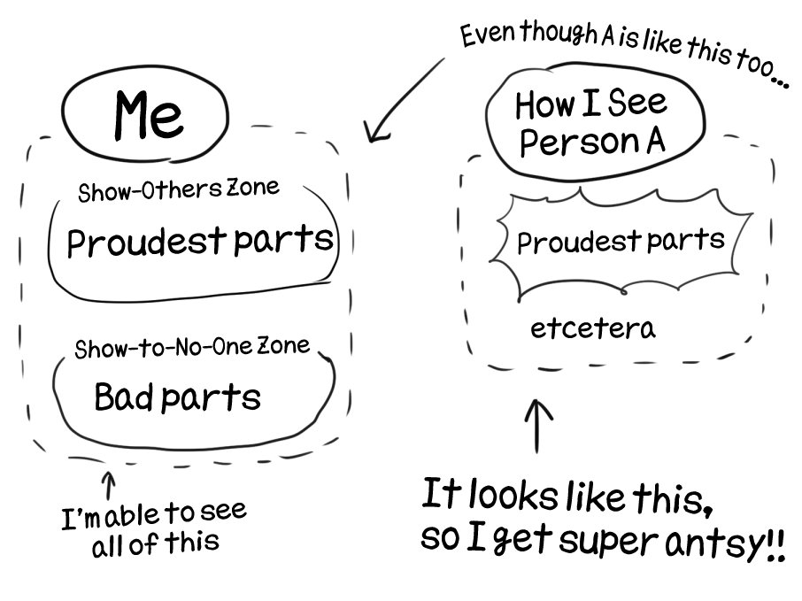 I'm incredibly scared of people watching me, because my mind directly connects it to being put in front of others to be judged and subsequently rejected. I try my best not to make them feel too bad, but it's so needlessly awkward it does make them feel bad. And then of course, I feel bad too... It's an endless spiral.