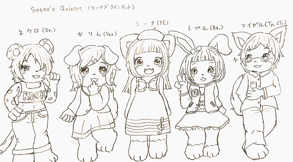 [Left to right: Neuro (Dr.), Karin (Sax.), Seana (Pf.), Lepul (Ba.), Meisel (Tp. Cl.)]