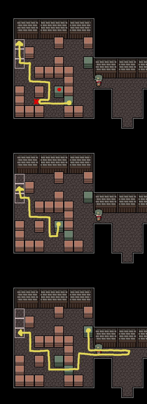 (Solution. When the first box is at the red X, move the other box down and right out of the way.)