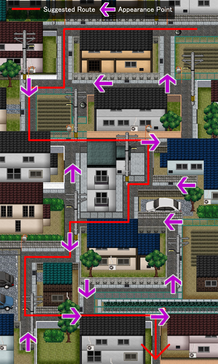 Click here for a guide through the residential district. The place to be most careful is the bottom-left, as you'll collide with the shadow if you keep walking forward. Approach the intersection carefully and go to the right as soon as possible.