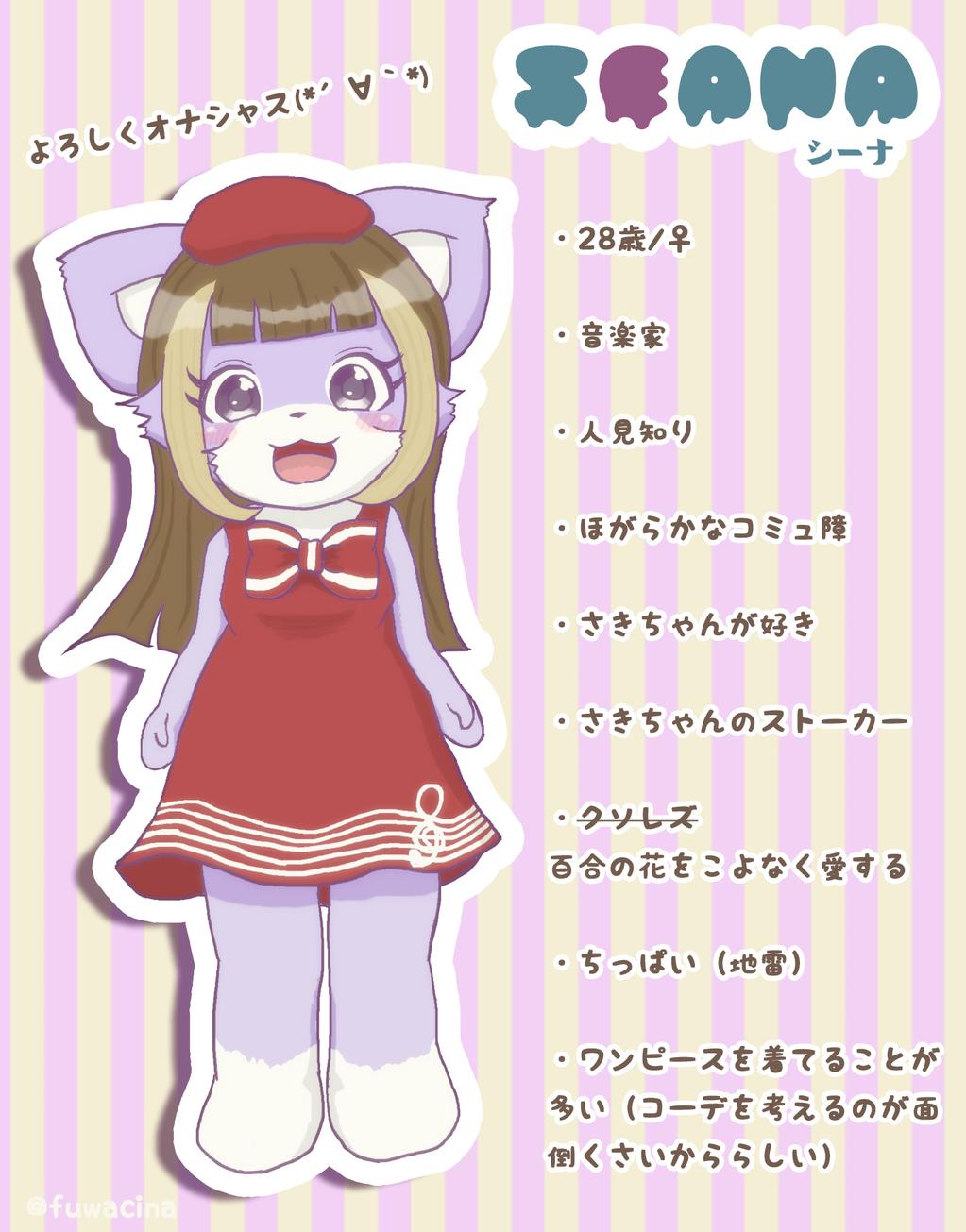 [Seana; female; 28 years old; musician; shy; cheerfully bashful; loves Saki-chan; Saki-chan's stalker; hella gay adores lilies, small-boobed (touchy subject)]