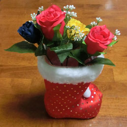 It contains roses of three colors (artificial, of course) and jelly sticks of some familiar characters.
