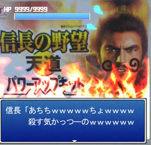 Nobunaga: "Yeouch! (laughs) Geez! (laughs) You tryin' to kill me? (laughs)"